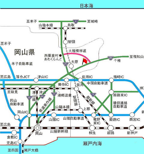 姫路から播但連絡道路で福崎インターを経て、中国自動車道作用インターへ。佐用IC下車R373で大原へ。